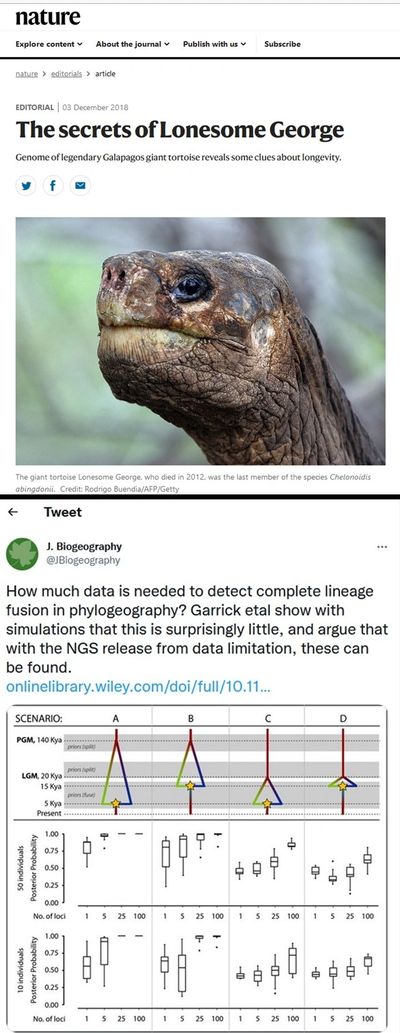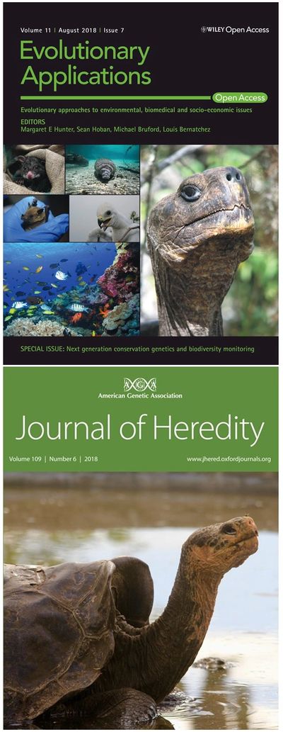 GAUGHRAN SJ, QUINZIN MC, MILLER JM, GARRICK RC, EDWARDS DL, RUSSELLO MA, POULAKAKIS N, CIOFI C, BEHEREGARAY LB, CACCONE A (2018) Theory, practice, and conservation in the age of genomics: the Galápagos giant tortoise as a case study. Evolutionary Applications, 11:1084–1093. [PDF]