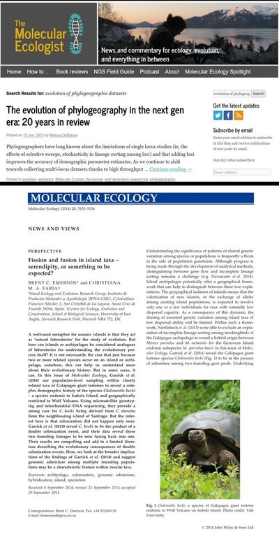 GARRICK RC, BENAVIDES E, RUSSELLO MA, HYSENI C, EDWARDS DL, GIBBS JP, TAPIA W, CIOFI C, CACCONE A (2014) Lineage fusion in Galápagos giant tortoises. Molecular Ecology, 23:5276–5290. [PDF]