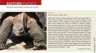 GARRICK RC, BENAVIDES E, RUSSELLO MA, GIBBS JP, POULAKAKIS N, DION KB, HYSENI C, KAJDACSI B, MARQUEZ L, BAHAN S, CIOFI C, TAPIA W, CACCONE A (2012) Genetic rediscovery of an ‘extinct’ Galápagos giant tortoise species. Current Biology, 22:R10–R11. [PDF]